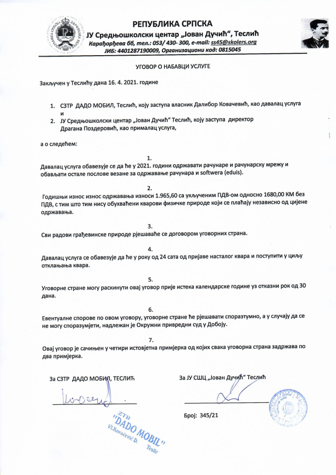 Јавне набавке Danijel Vidović Javne nabavke 20 април 2021 Уговор о набавци услуге одржавања рачунара и рачунарске опреме 2021 година Штампа Ел. пошта Претходна