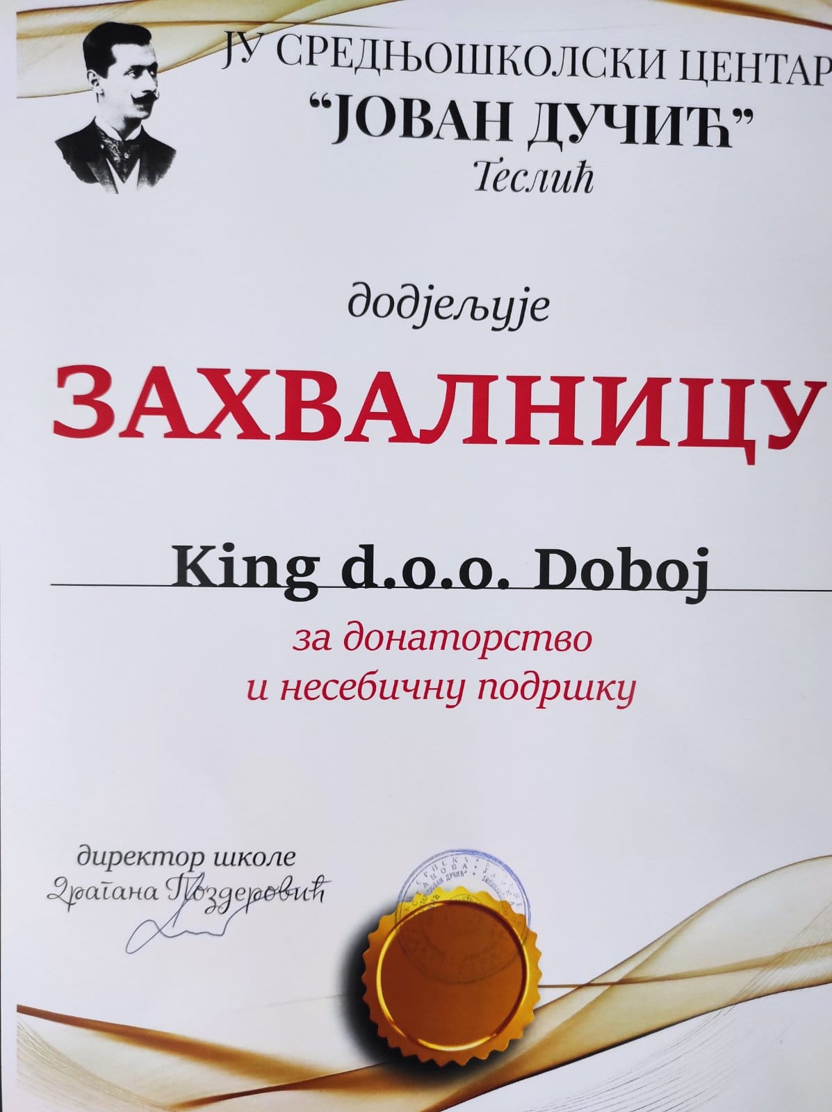 ЈУ СШЦ "Јован Дучић" Теслић изражава посебну захвалност ДОО Кинг Добој за донаторство и подршку раду школе.